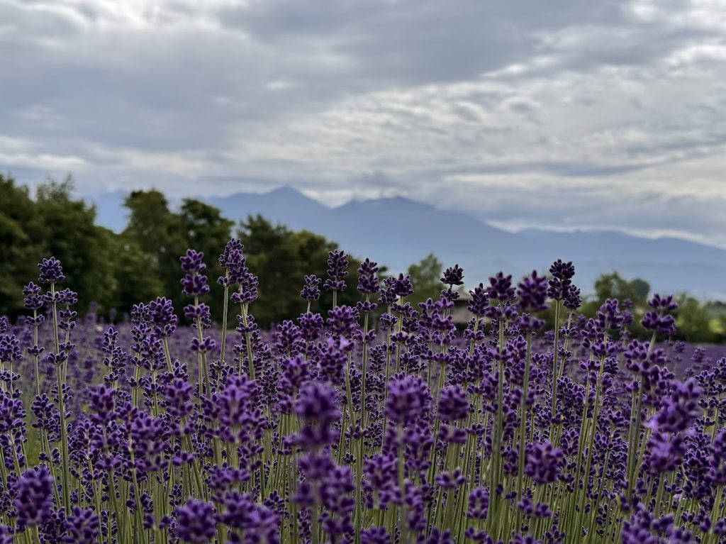 今回の写真は、まさに見頃を迎えたラベンダー畑の様子。一面に広がる紫の花々と、背景に佇む緑の木々、そして遠くに連なる山並みとのコントラストが、まるで絵画のような美しさを演出しています。